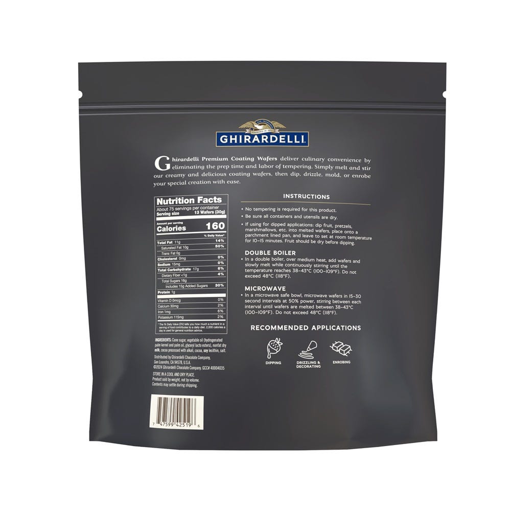 Simplify dessert production with Ghirardelli Premium Coating Wafers—now available in convenient 5-lb. bags. Consistent, efficient, and versatile, these compound wafers melt smoothly for easy dipping, drizzling, or enrobing—no tempering required. Try both Dark Coating Wafers and White Coating Wafers: simply delicious, simply done.